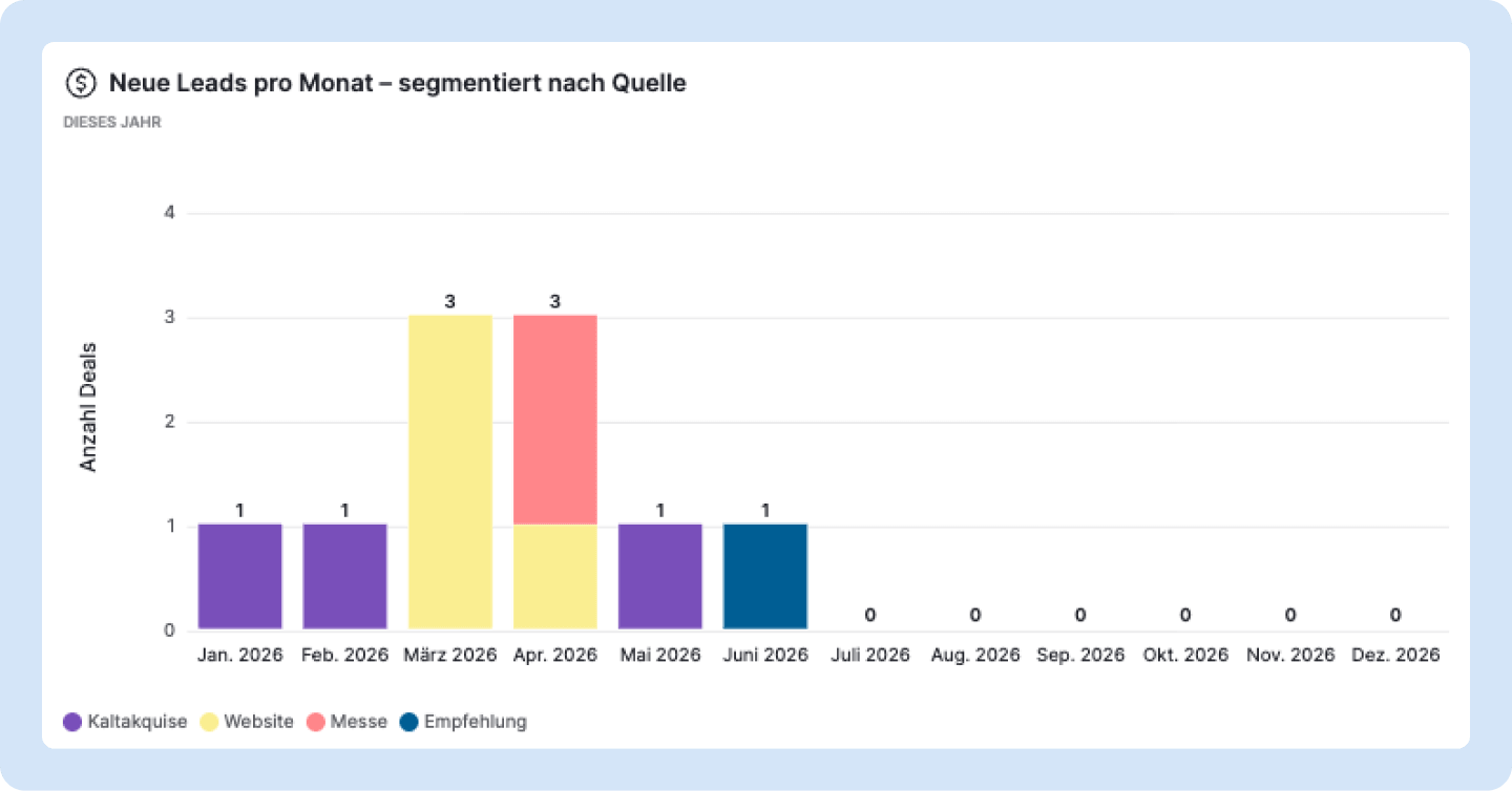 Warum es wichtig ist: Diese Zahl zeigt das Wachstum der Pipeline. Segmentiert nach Lead-Quelle wird sofort sichtbar, welche Kanäle wirklich funktionieren, z. B. Website, Empfehlung, Messe, Kaltakquise . Im Jahresvergleich lassen sich außerdem saisonale Schwankungen erkennen.
