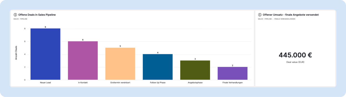 Was du siehst: Wie viele Deals gerade aktiv sind, welches Umsatzpotenzial dahintersteckt, aufgeschlüsselt nach Phase.