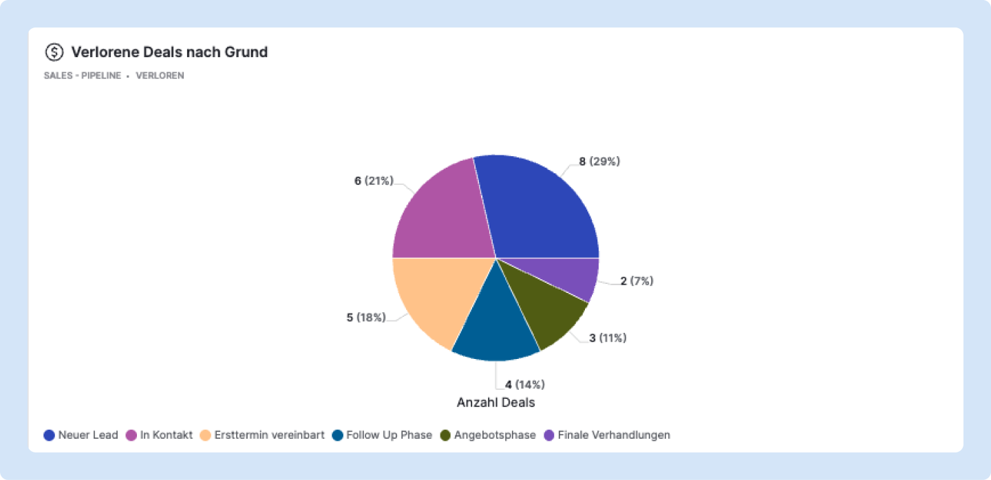 Warum es wichtig ist: Verluste sind wertvolle Informationen – wenn sie sauber dokumentiert werden. „Zu teuer", „Konkurrenz", „kein Bedarf", „kein Budget". Jede Kategorie erzählt eine andere Geschichte.