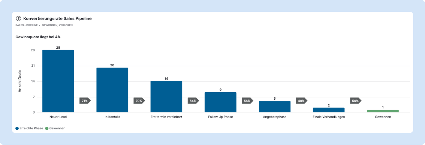 Warum es wichtig ist: Eine gesunde Pipeline hat viele Deals am Anfang und weniger in den späteren Phasen. Wenn die letzten Phasen voller sind als die ersten, fehlt Nachschub. Wenn alle Deals in Phase 1 feststecken, gibt es ein Qualifizierungsproblem.